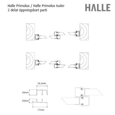 Halle Primolux Insulators leveres med kantede profiler med tidløse former, D4-9 isoleringsglas – dobbelt 4 mm glas med en luftspalte imellem. Primolux Insoler-satserne leveres med en integreret drypstrimmel i den øverste kant.